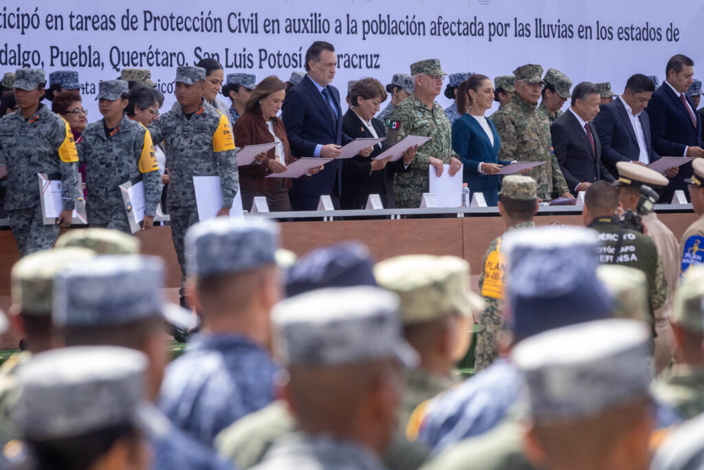 Durante dicha ceremonia se dio a conocer que, durante la atención a esta contingencia, se creó el puente aéreo más grande del país, con la participación de 21 helicópteros, con lo cual se apoyó a más de 100 mil mexicanos para trasladarse, así como para acercar alimentos y medicinas a quienes más lo necesitaban. Ante ello, la Presidenta de México agradeció su entrega y compromiso por defender a las y los mexicanos.
