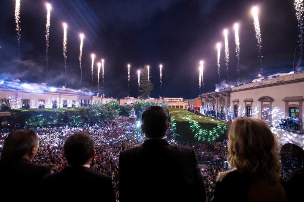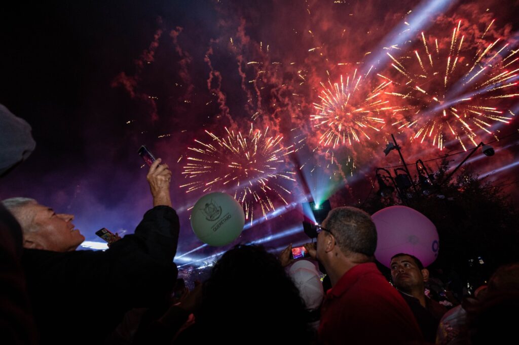 Concluida la ceremonia cívica, el Gobernador, su familia, representantes de los poderes Judicial y Legislativo, invitados especiales, así como las queretanas y queretanos que se reunieron en Plaza de Armas, atestiguaron el espectáculo con video mapping, luces, música y drones que enmarcó la celebración del Grito de Independencia.
