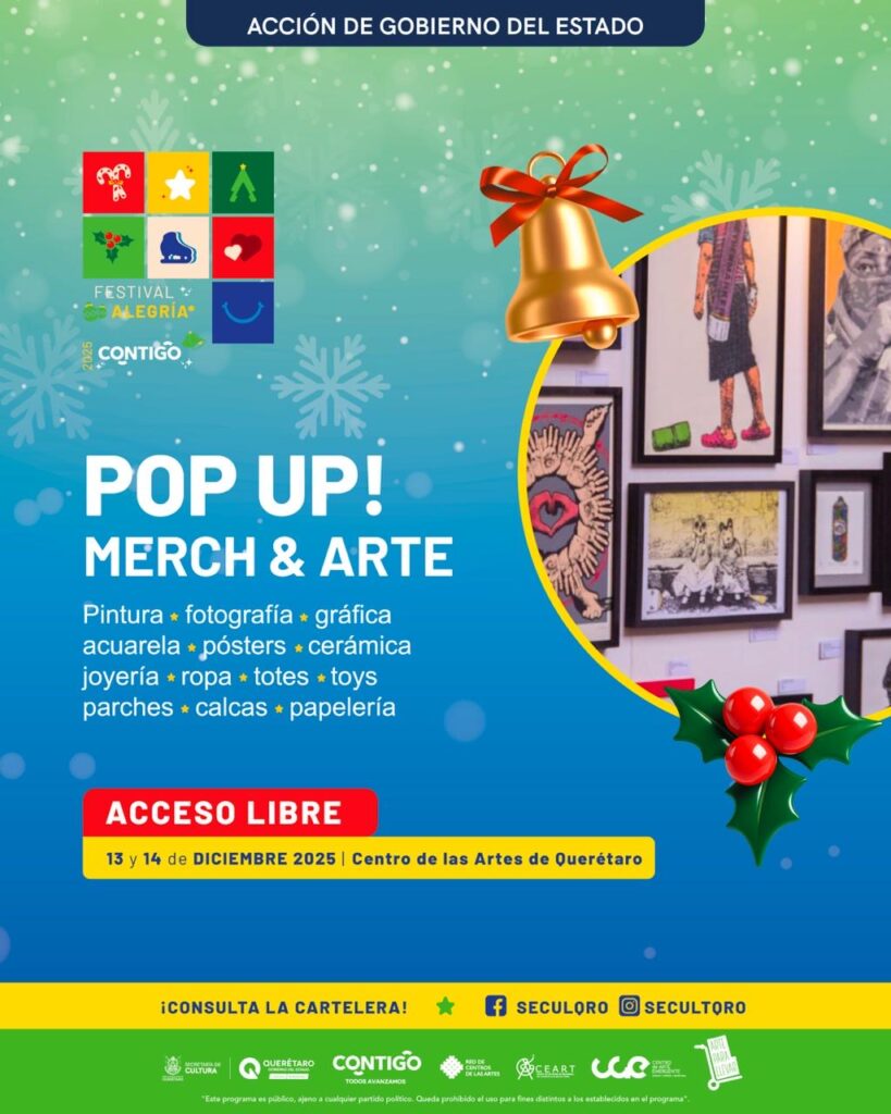 Con el objetivo de acercar a la ciudadanía el arte a través de objetos, piezas y mercancía creadas por artistas, además de abrir nuevos caminos para que las y los creadores consoliden modelos de sustentabilidad económica, la secretaria de Cultura del estado, Ana Paola López Birlain, presentó el Pop Up! Merch and Arte, que tendrá lugar en el Centro de las Artes de Querétaro (CEART) los días 13 y 14 de diciembre.